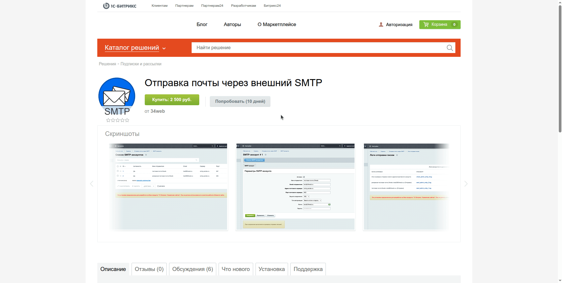 Включение раздела управления SMTP-аккаунтами, просмотр логов и отправка почты начинает работать только после включения работы модуля на странице настройки параметров - "Настройки → Настройки продукта → Настройки модулей → Отправка почты через SMTP".